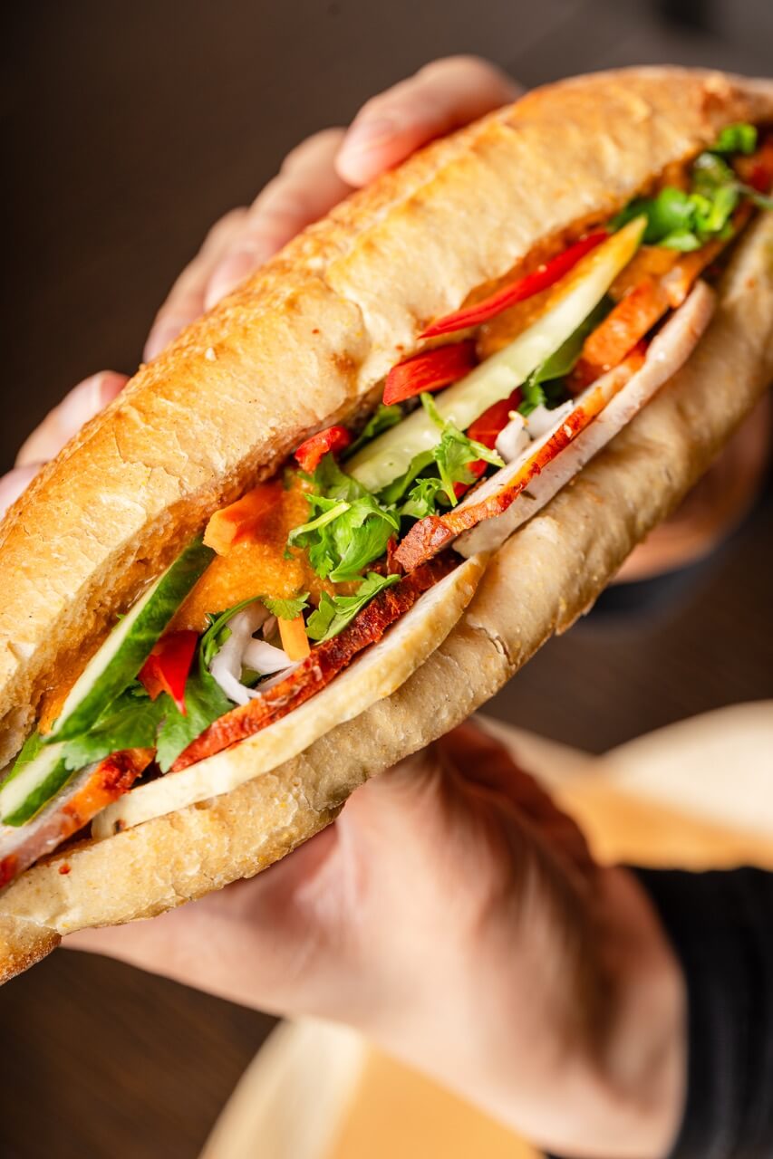 Wer Bánh mì in Hamburg sucht, findet bei uns das Original: ein vietnamesisches Baguette mit hauchdünner, knuspriger Kruste und locker-fluffiger Krume – frisch aufgebacken und frisch belegt. Unsere Bánh-mì-Sandwiches kombinieren hausgemachte Füllungen (z. B. Pastete, Xá Xíu-Schweinefleisch, vietnamesische Wurst oder Tofu), knackiges Gemüse, eingelegte Pickles, Koriander und aromatische Saucen. So entsteht das typische Streetfood-Profil: herzhaft, leicht süß-säuerlich, frisch und umami.